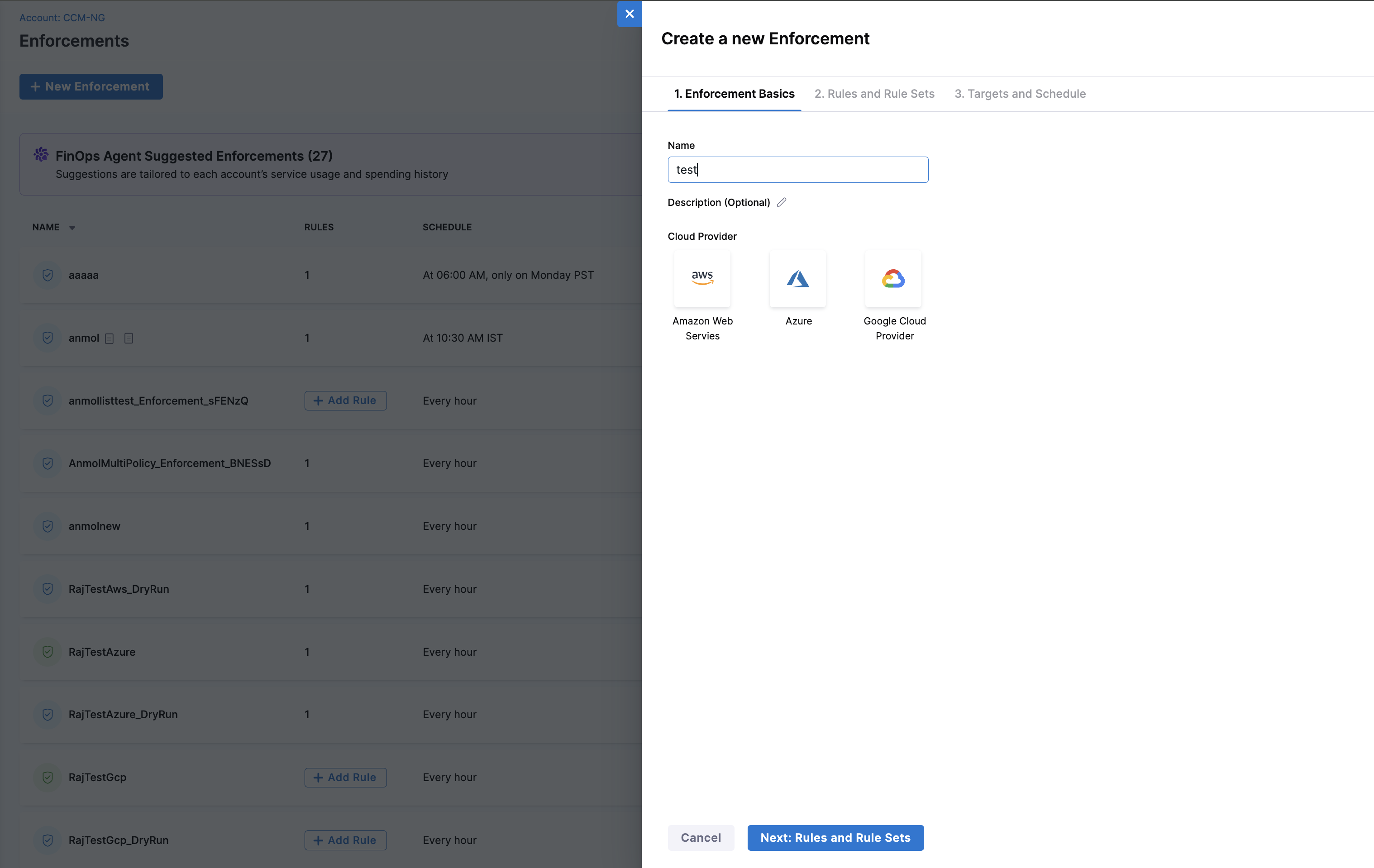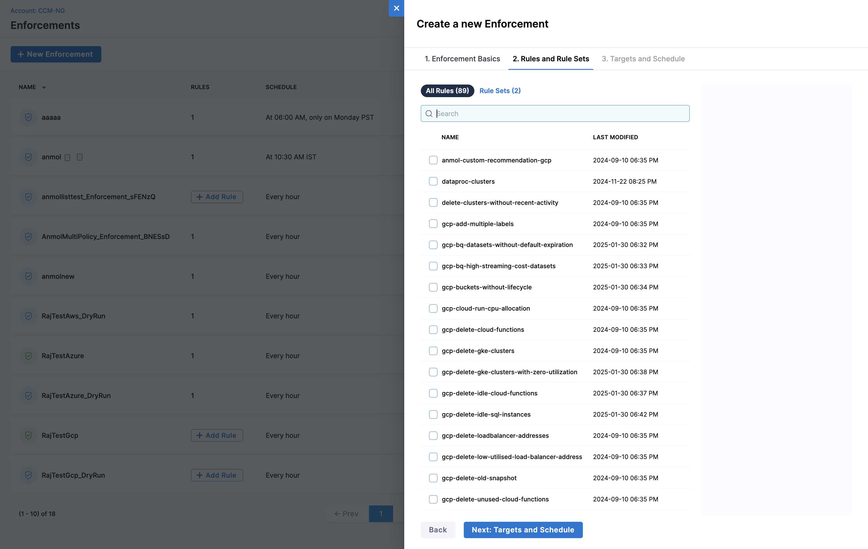 Enforcements enable you to enforce a certain set of Rules or Rule Sets (also known as governance guardrails) against a specific set of targets (accounts, projects, or subscriptions) to run periodically. Sometimes, we need rules to run periodically, such as every day, week, or month. However, running these rules manually every day or week at a specified time creates extra overhead and is a slow process prone to manual errors. To solve this, you can use Enforcements that allow you to set up a timely schedule and choose the day, time, and frequency for their rules or rule sets.