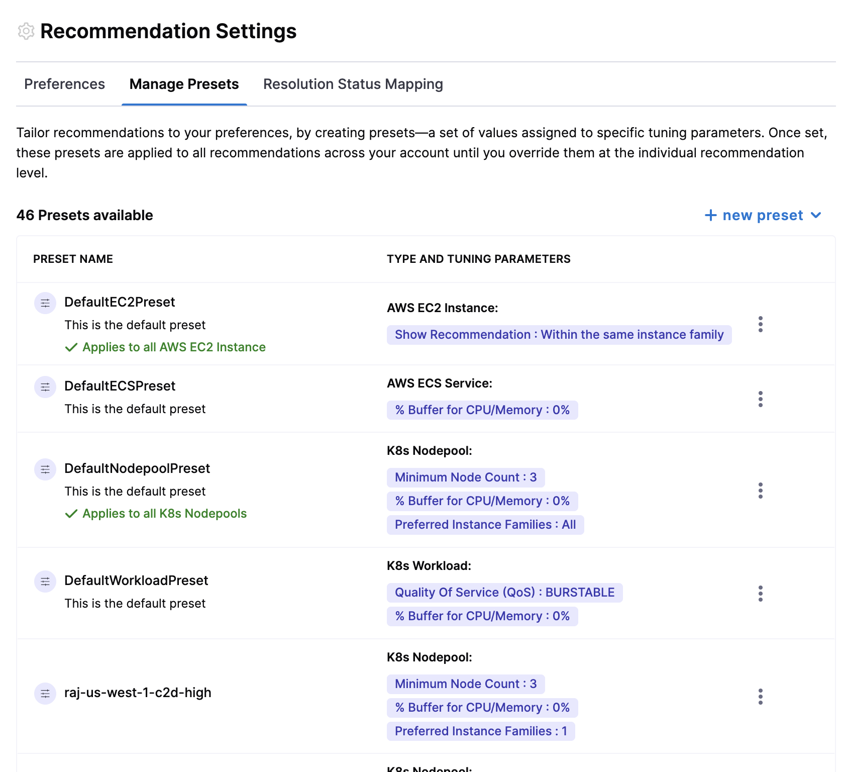 This helps users to create and save customized configurations for their recommendations. These presets capture specific user preferences, such as tuning parameters for resource types like workloads, nodepools, ECS, and EC2 instances.