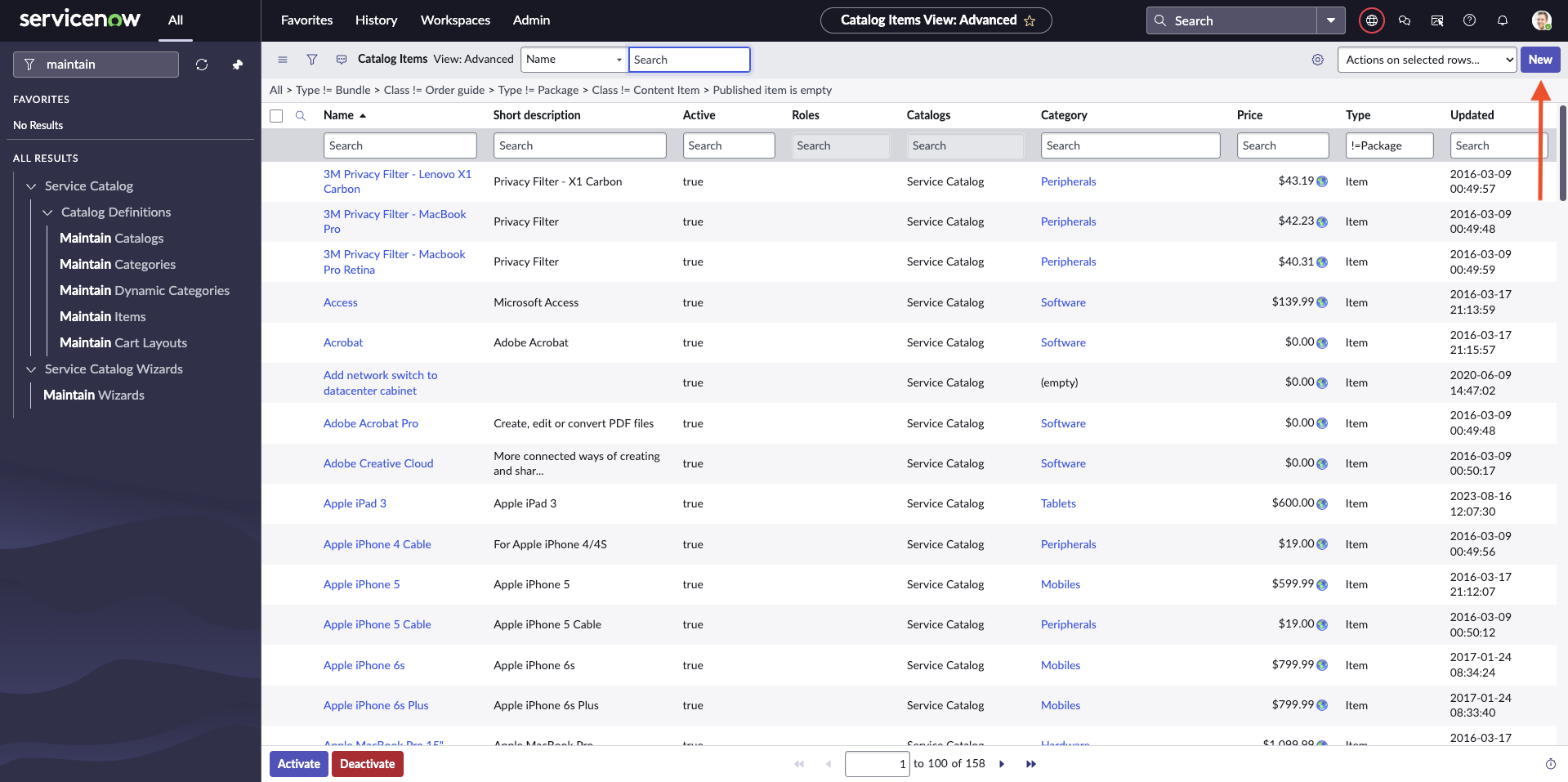 - Click "New" in the top right corner to create a new catalog item.