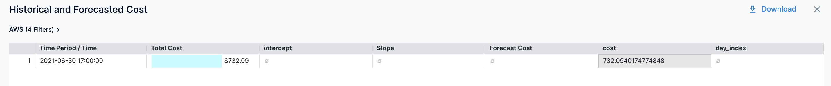 | Historical and Forecasted Cost | The historical and forecasted AWS cost. Forecasted cost is the prediction based on your historical cost data and it is predicted for the same future time period as your selected time range. | ![]() |
