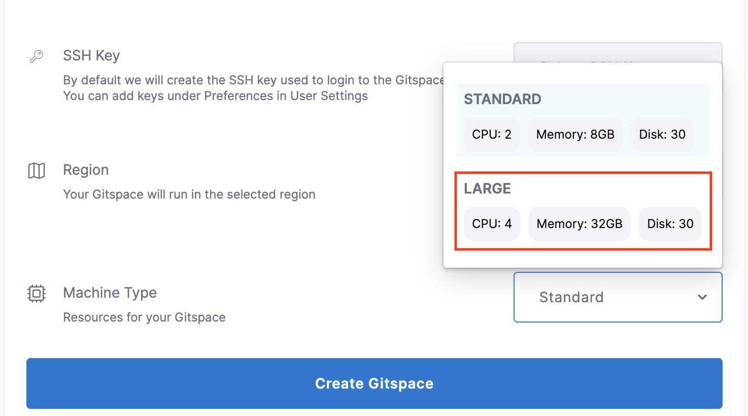 To meet the recommended specifications, select the "Large" machine type while configuring your Gitspace in the Harness UI. This option provides: