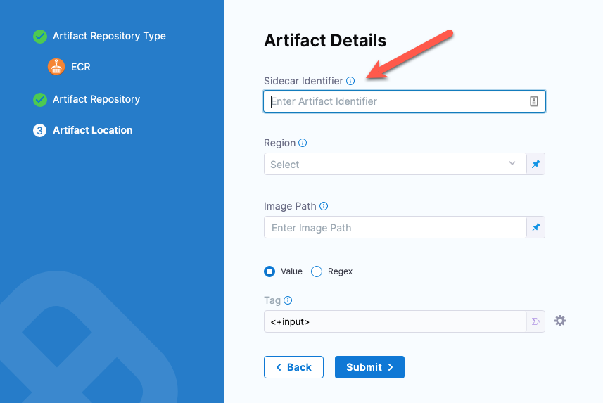 You reference sidecar artifacts with the format <+artifacts.sidecars.[artifact_Id]>.