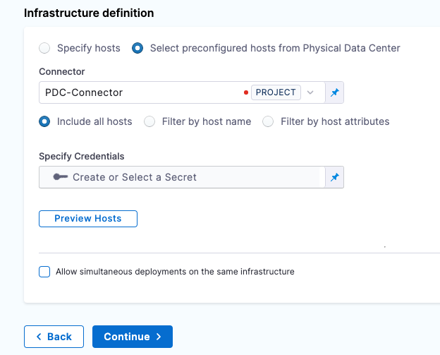 When you set up the Infrastructure Definition for the stage, there are three options for selecting the target hosts: