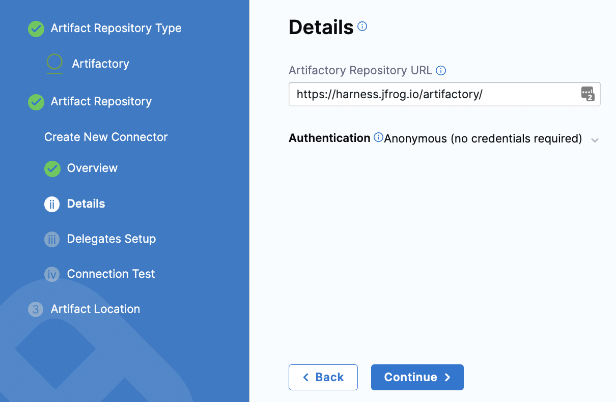 7. Click Continue to connect with Artifactory by using a Harness Delegate.