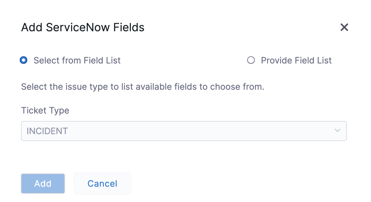 1. Select Configure Fields to select or add ServiceNow Fields to your ServiceNow ticket. This option enables you to access multiple custom fields from your ServiceNow integration.