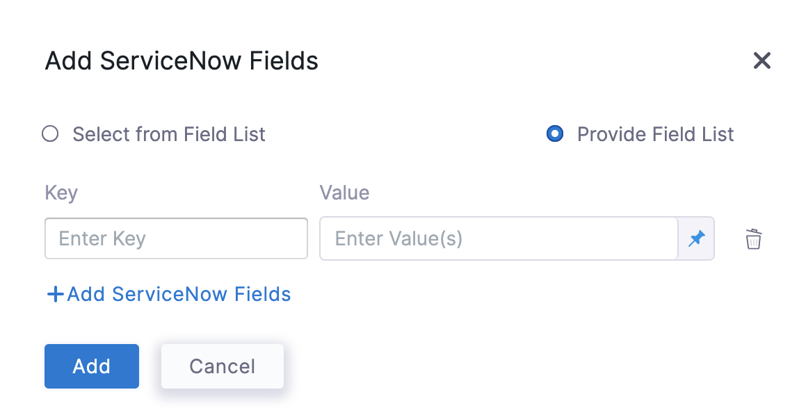 4. Click Fields. The Add ServiceNow Fields settings appear.
