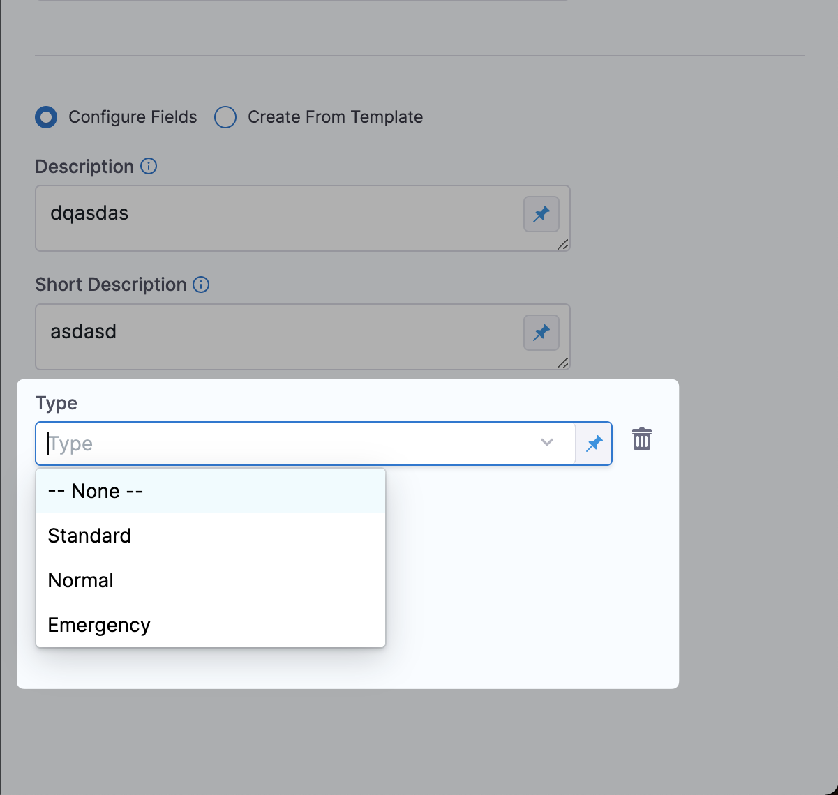 This option appears only when the value type in the Ticket Type field is Fixed value, and the ServiceNow ticket type specified is Change Request. This feature can be used to create low-risk standard change requests using pre-approved standard templates.
