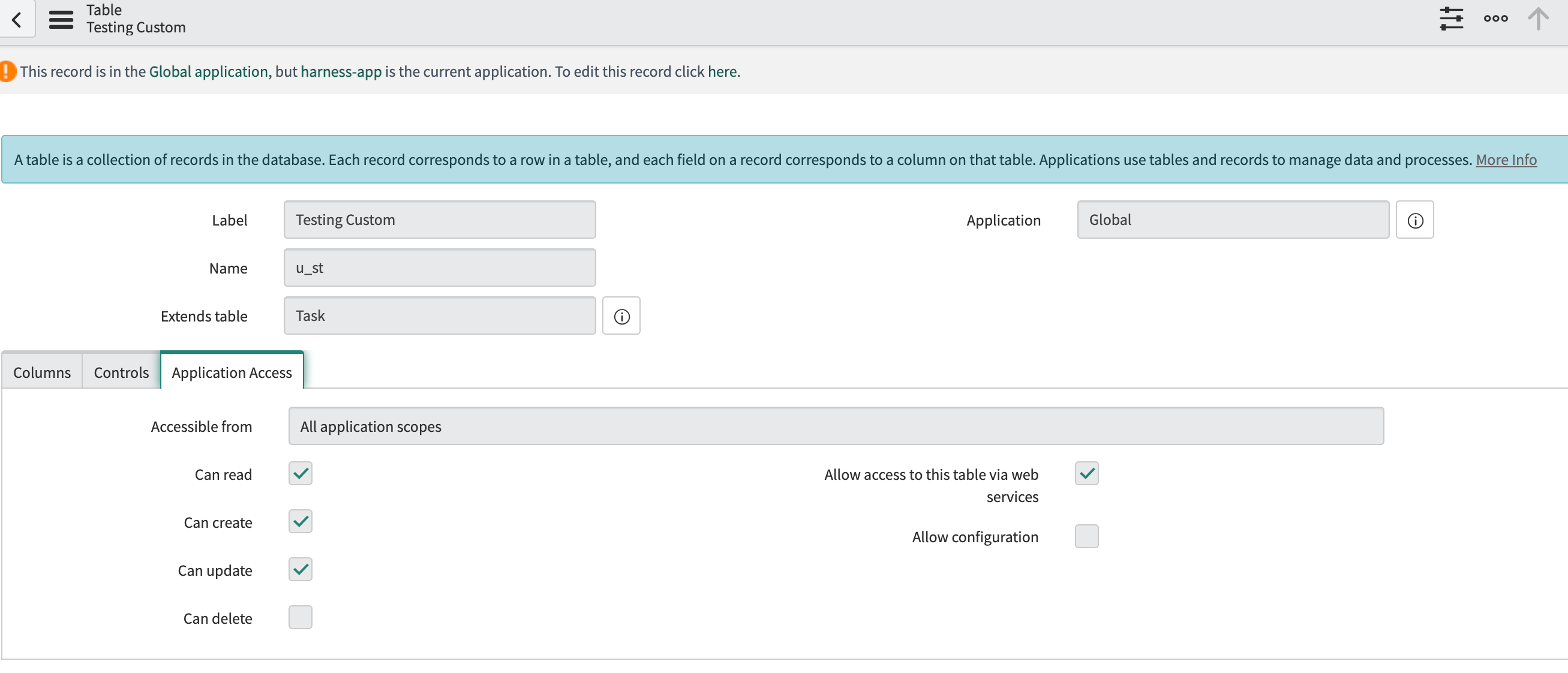 1. Add three (create, read, write) cross-scope privileges from the harness-app to the global scope with the target name as the table name (u_st in this example) and set the Status as Allowed.