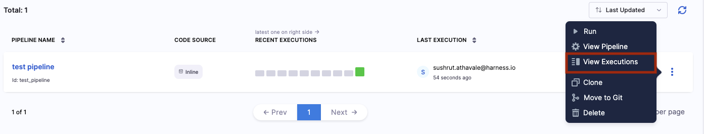In the Harness UI left navigation, select Pipelines. A list of pipelines created under the project appears.