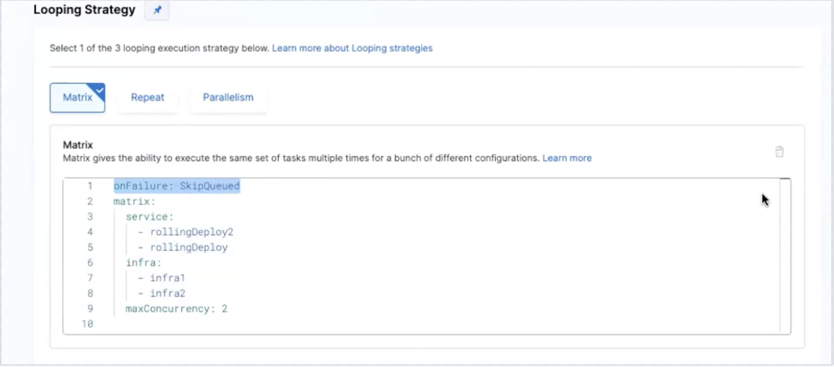 In the example above, we have given given failure srategy for multideployment as RunAll, for example there is an issue with ser_1 and both the stages in series fails as well as there is an issue with infra_2 due to invalid configuration of artifact and connectors. In this case stage with (ser_1 infra_2), (ser_2 and infra_2) and (ser_1 and infra_1) will fail. The RunAll failure strategy ensures that even though these stages are failing (ser_2 and infra_1) proceeds with the deployment.