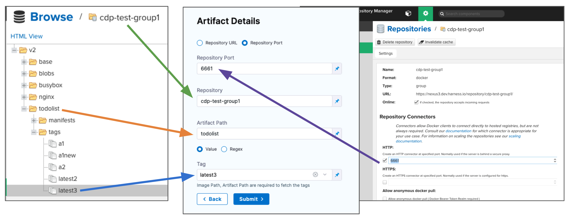 When you select the artifact repo for the artifact, like a Docker Hub repo, you specify the artifact and tag/version to use.
