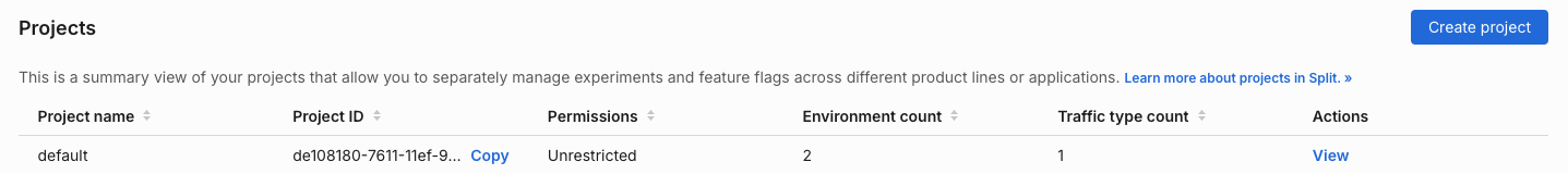 Click the View link in the Actions column to see a project's environment names and IDs.