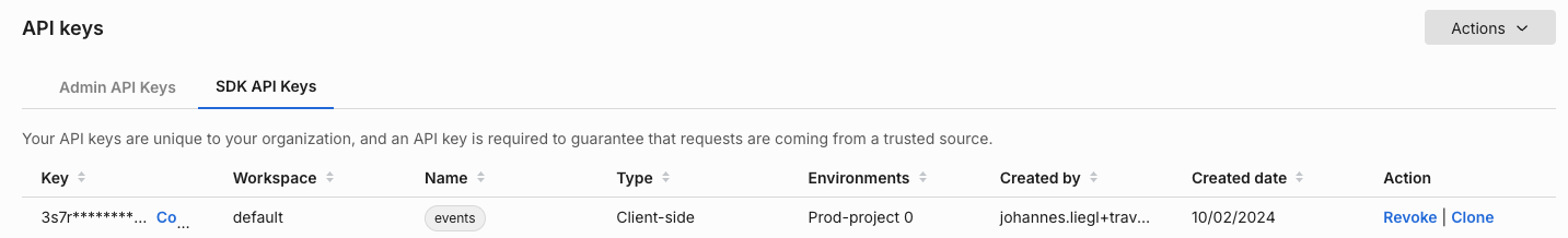 • In the Admin page, under the API keys page, Make sure all Admin API and SDK keys are revoked for the project environments. For example the screenshot below shows the SDK API key for the "default" project.