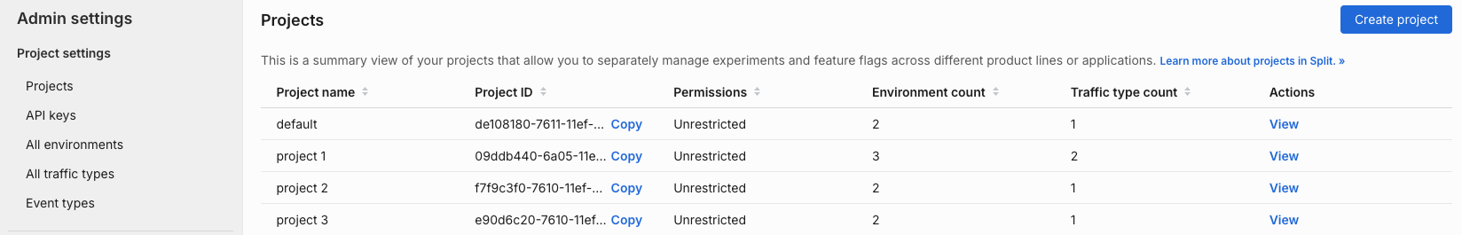 2. Click Admin settings, then Projects. A list of projects appears.