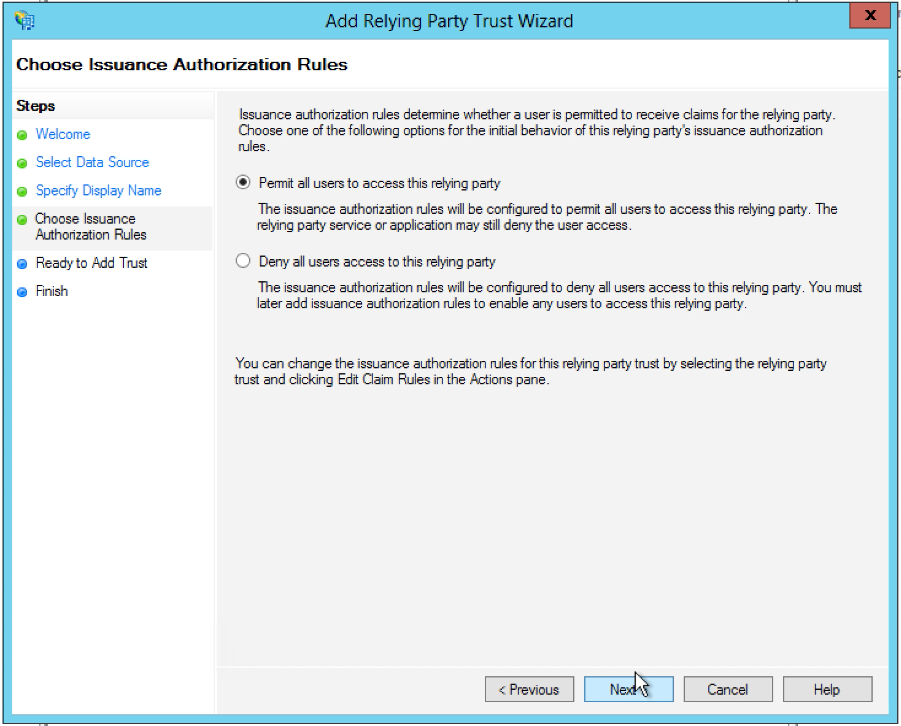 7. Select Permit all users to access this relying party, and then click Next.