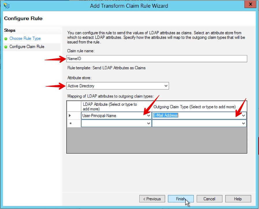 • Set the Claim rule name as NameID.
