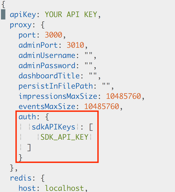 • Proxy mode usage: When Synchronizer is used in proxy mode (not Redis), the "auth" section and "sdkAPIKeys" allow setting custom API keys for internal use, enabling SDKs to use the internal custom API key.