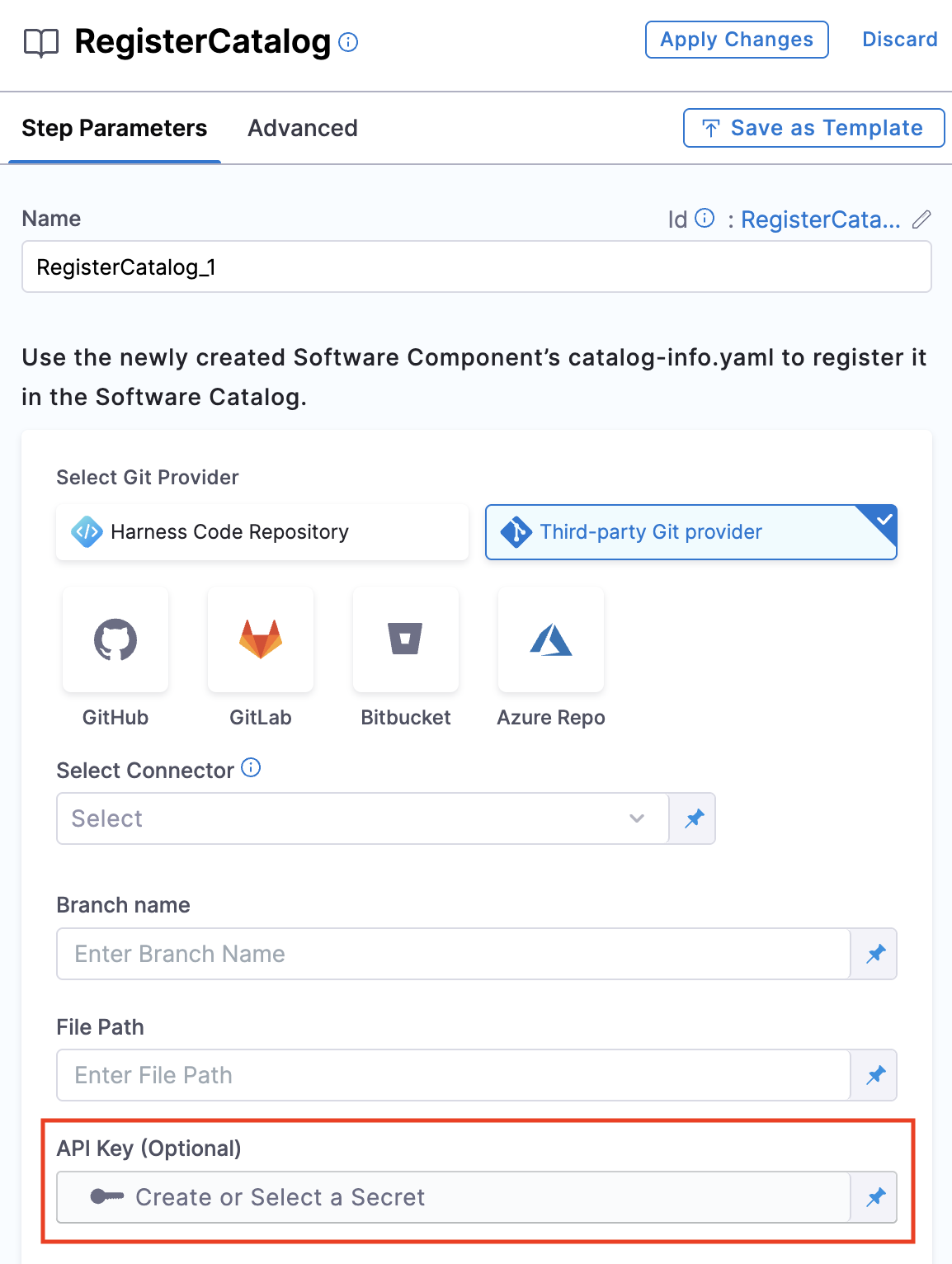 The API Key field is optional. If left empty, the credentials of the user executing the pipeline will be used to update the catalog entity.