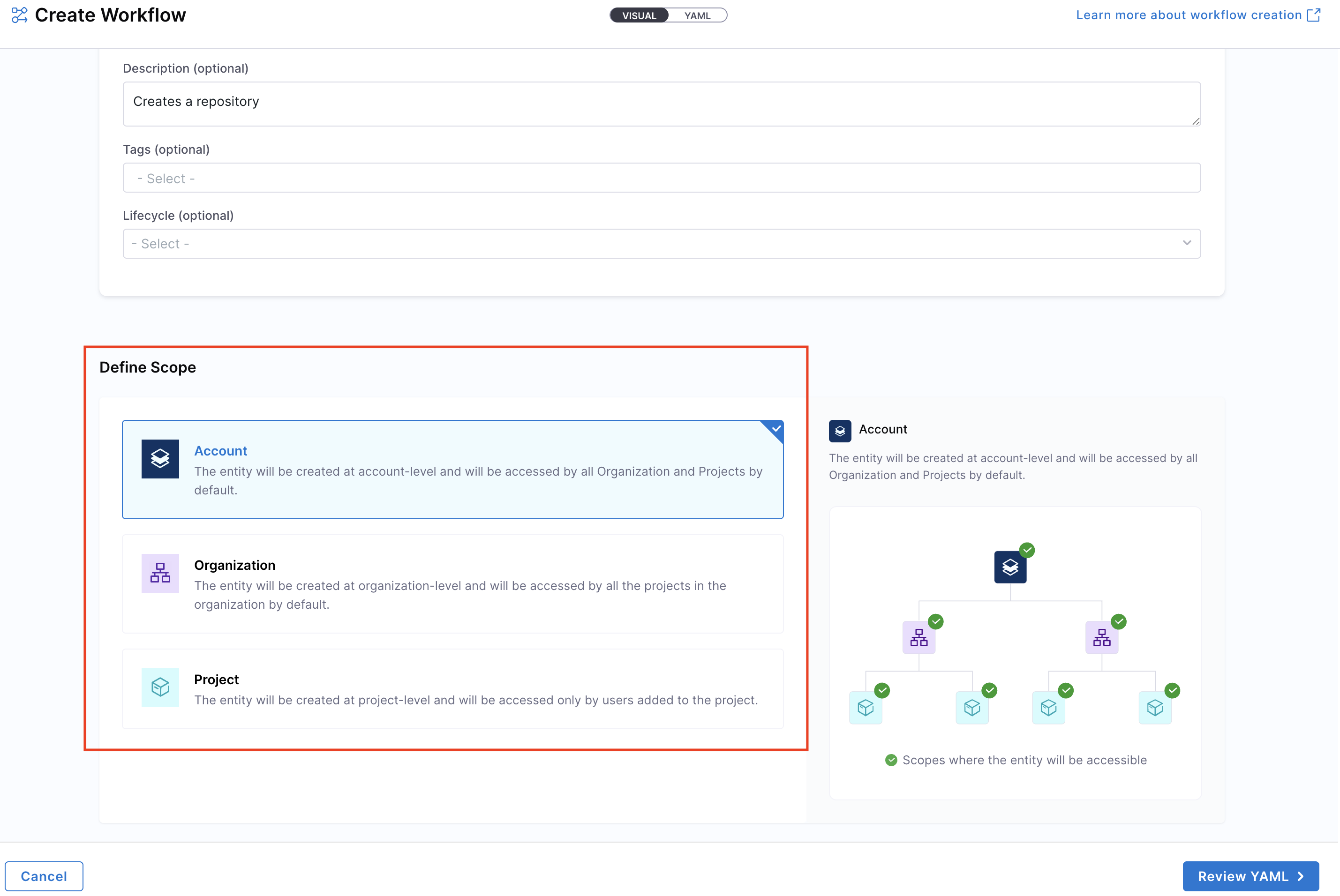 3. Define the Workflow scope — choose whether the Workflow should reside at the Account, Project, or Organization level. For this use-case, let's select the Account scope. Read more about Workflow RBAC.