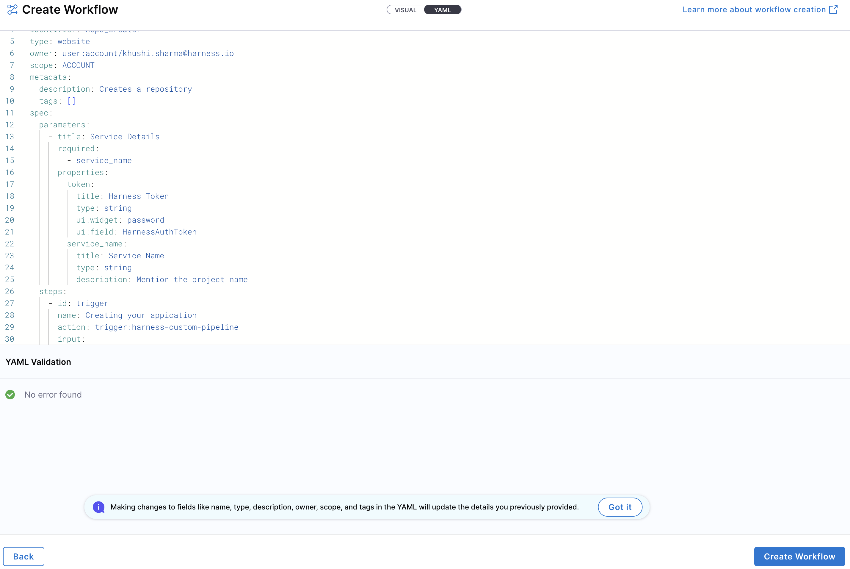 2. Enter the required Workflow information. The Visual view is synced in real-time with the YAML view for full transparency.