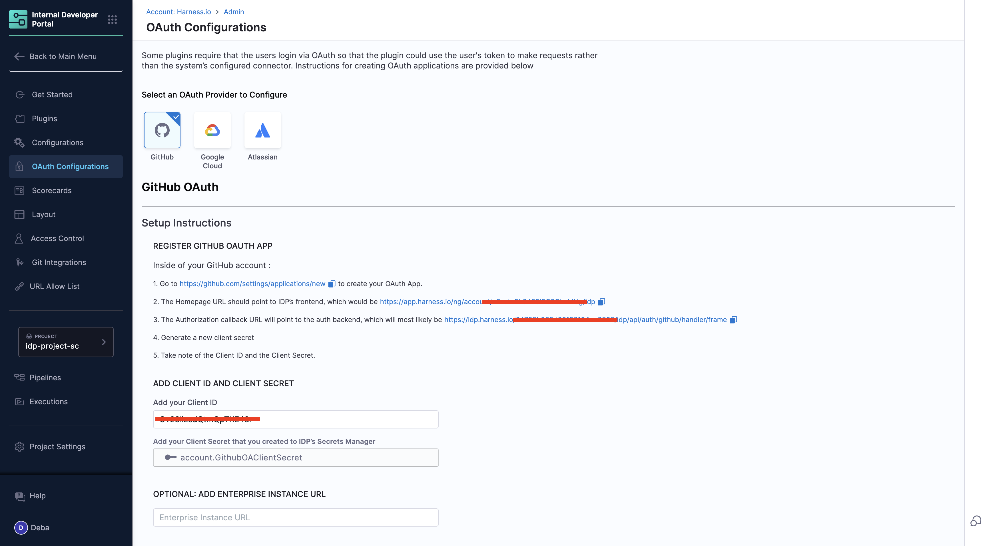 How to Set Up: Access to this JIRA card is authenticated via OAuth Configurations in IDP. To populate your task list, you need to add your Atlassian OAuth App client secret and ID in the configurations page, then developers can login from the homepage.