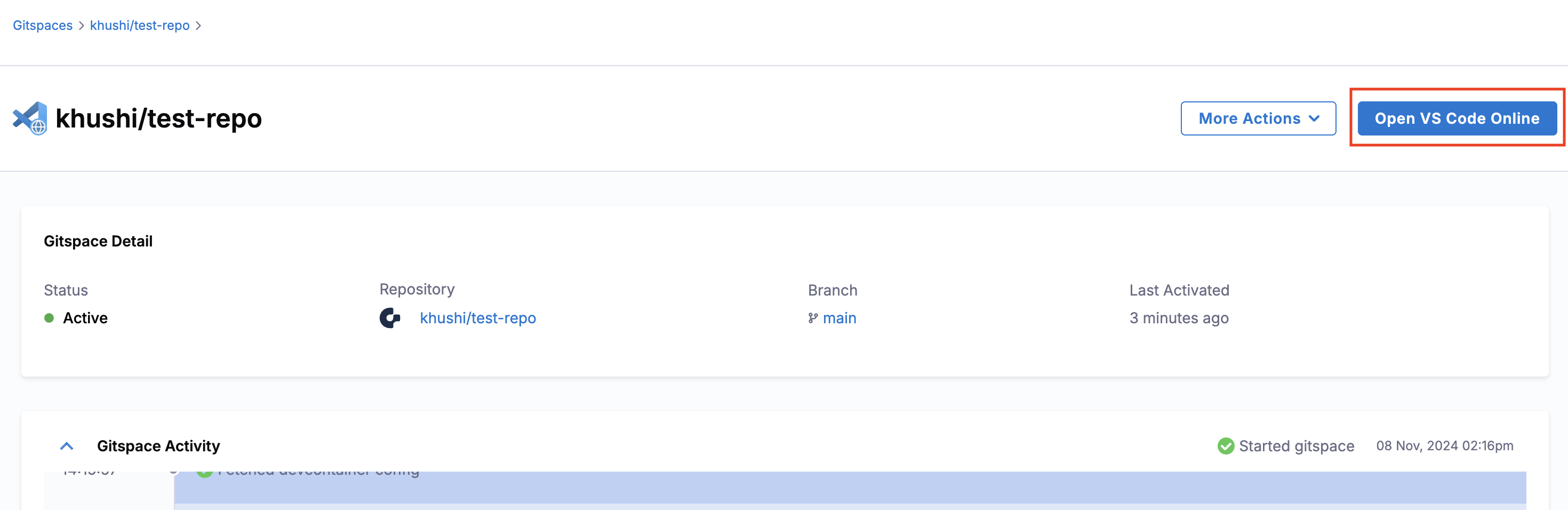 After the Gitspace is created, click “Open VS Code Onliner” from the Harness Open Source UI.