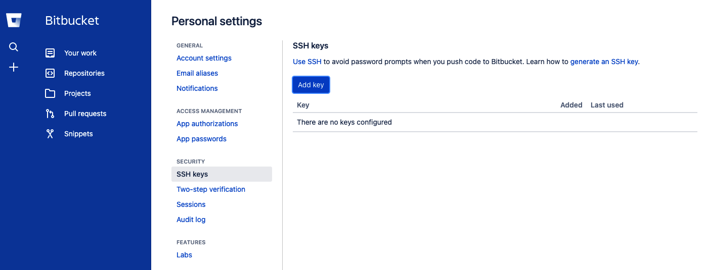 • SSH Key. This is the private key. The corresponding public key is added to your Bitbucket account settings.