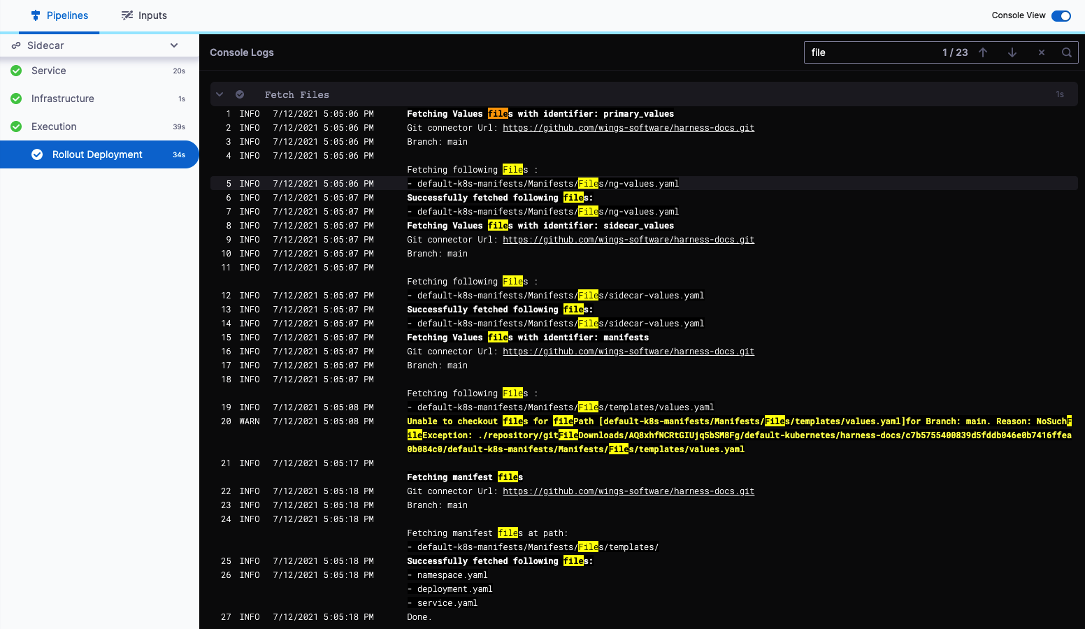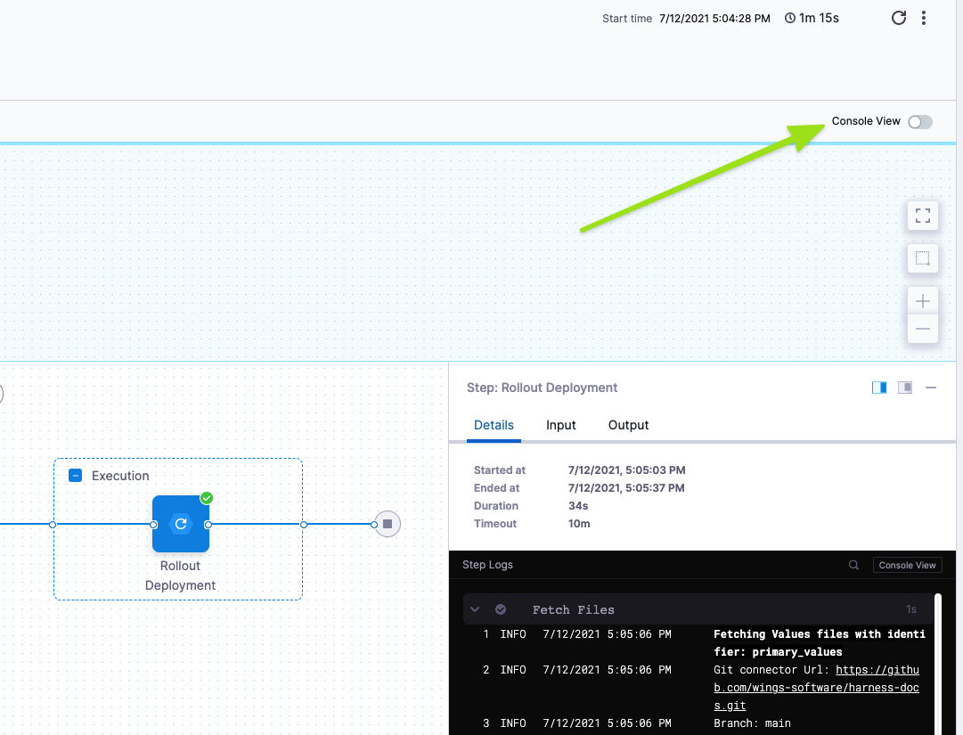 After running a pipeline in Harness, you can view the execution details, which include logs and other outputs. When viewing execution details, you can search logs in the console view.