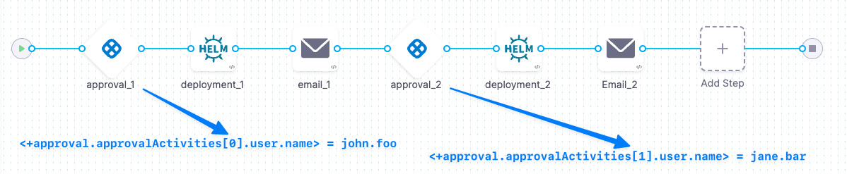 Whenever a user grants an approval in a Harness Manual Approval step, the pipeline maintains the user information of the approver for the rest of the pipeline execution. You can use these variables in notifications after an approval is granted.