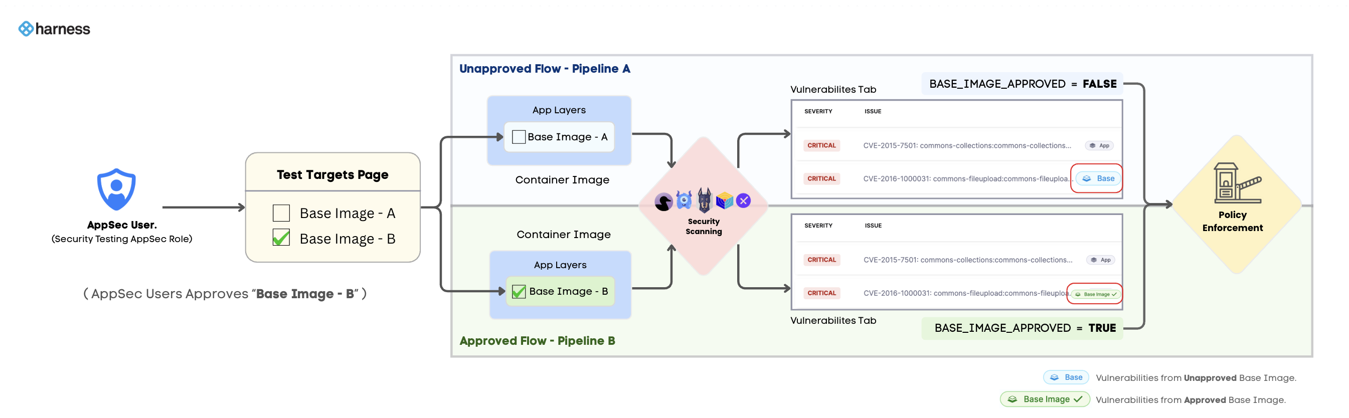 You can enforce policies on vulnerabilities from both application layers and base images by using the step output variables of your scanner step. Refer to Step Output Variables for App and Base Image Vulnerabilities for details.