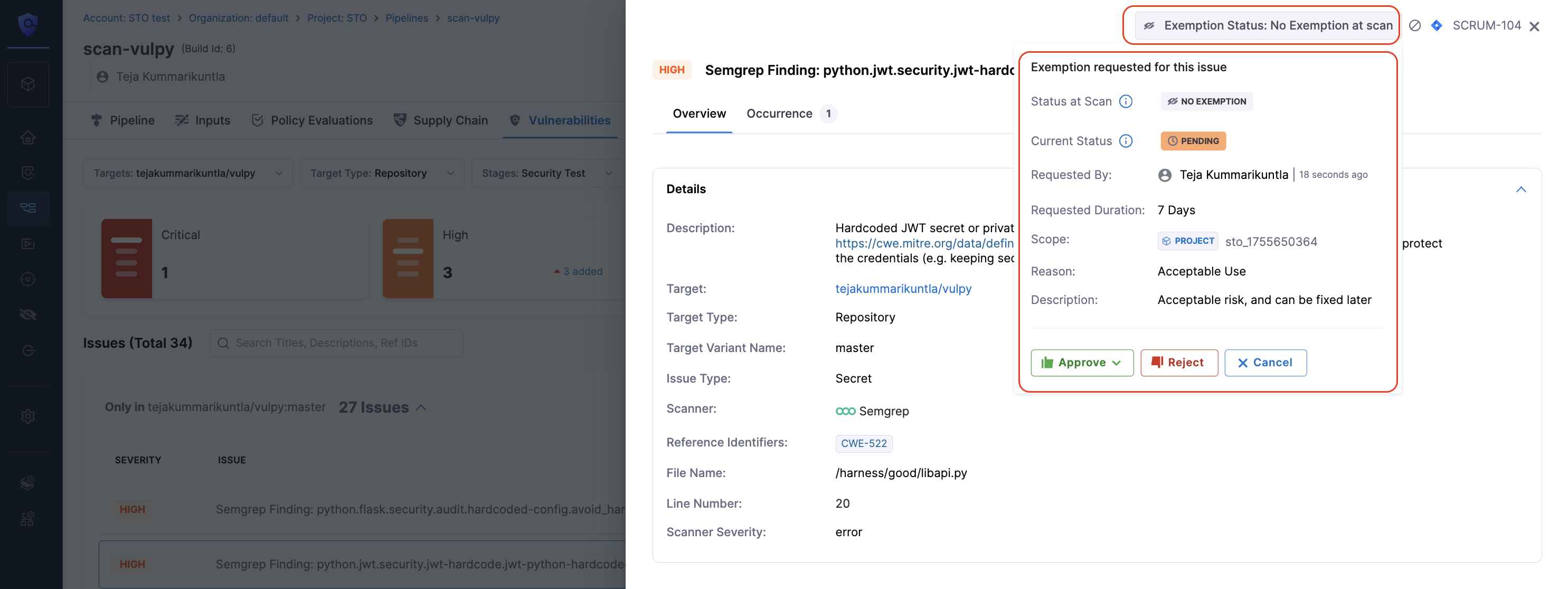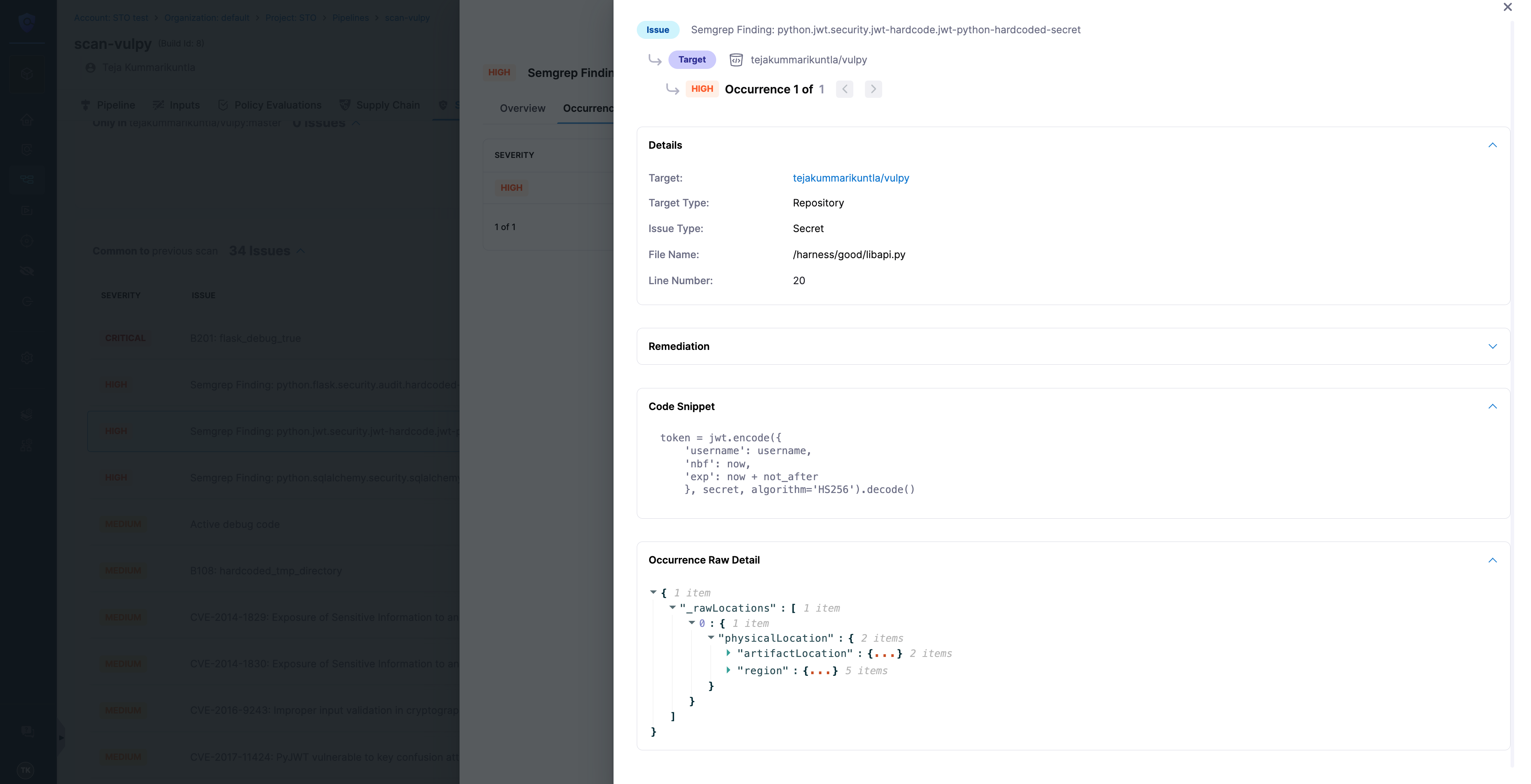 - Remediation: Steps from Harness AI and Scanner (see Fix security issues using Harness AI).
