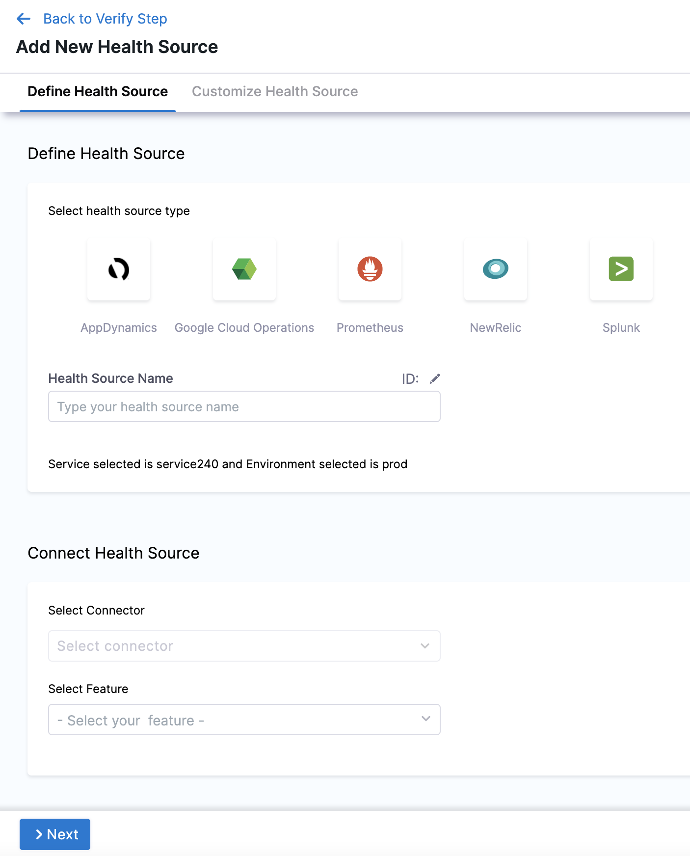 Go to the Service tab, and under Define Your Sources, select + Add New Health Source.