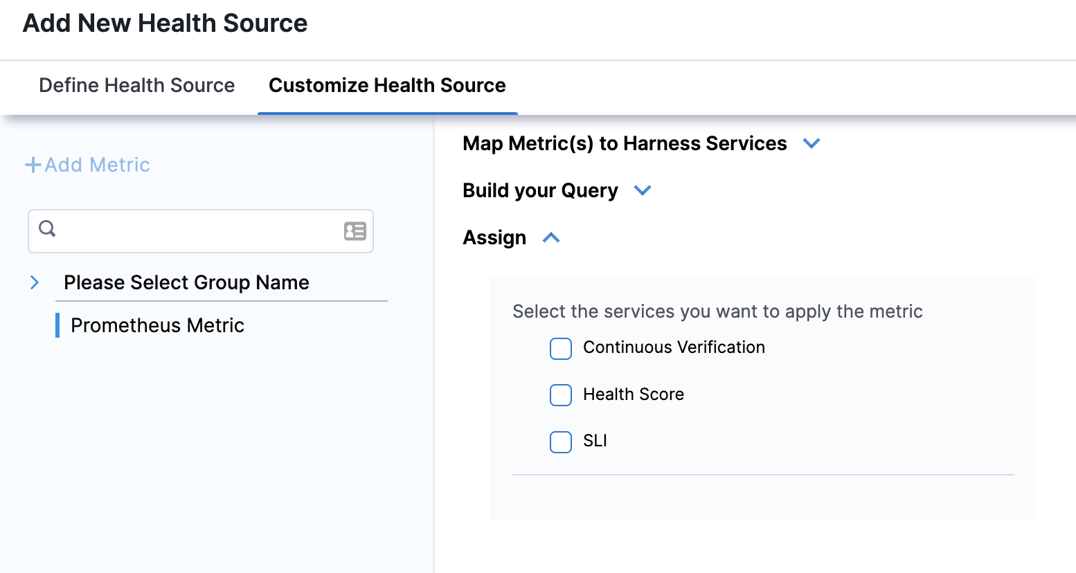 The subsequent settings in Customize Health Source depend on the Health Source Type you selected. You can customize the metrics to map the Harness Service to the monitored environment.