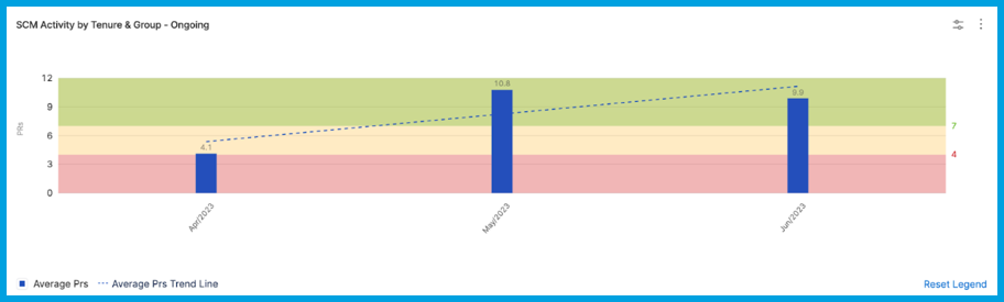 - Team 2 has a baseline of 20 commits per month as average and 12 commits per month as poor.
