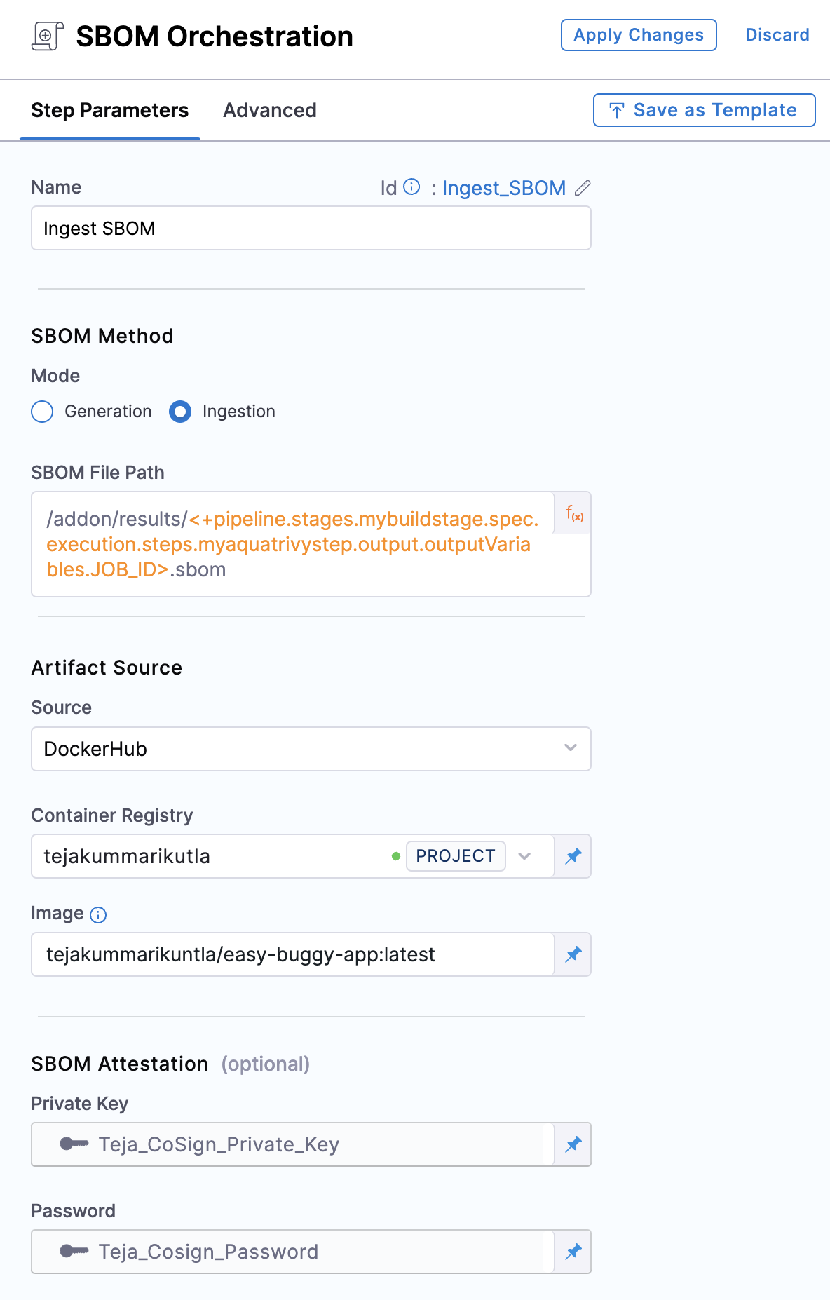 The Aqua Trivy STO step creates a JOB_ID output variable that you can use to reference the SBOM file path in the SBOM Orchestration step.